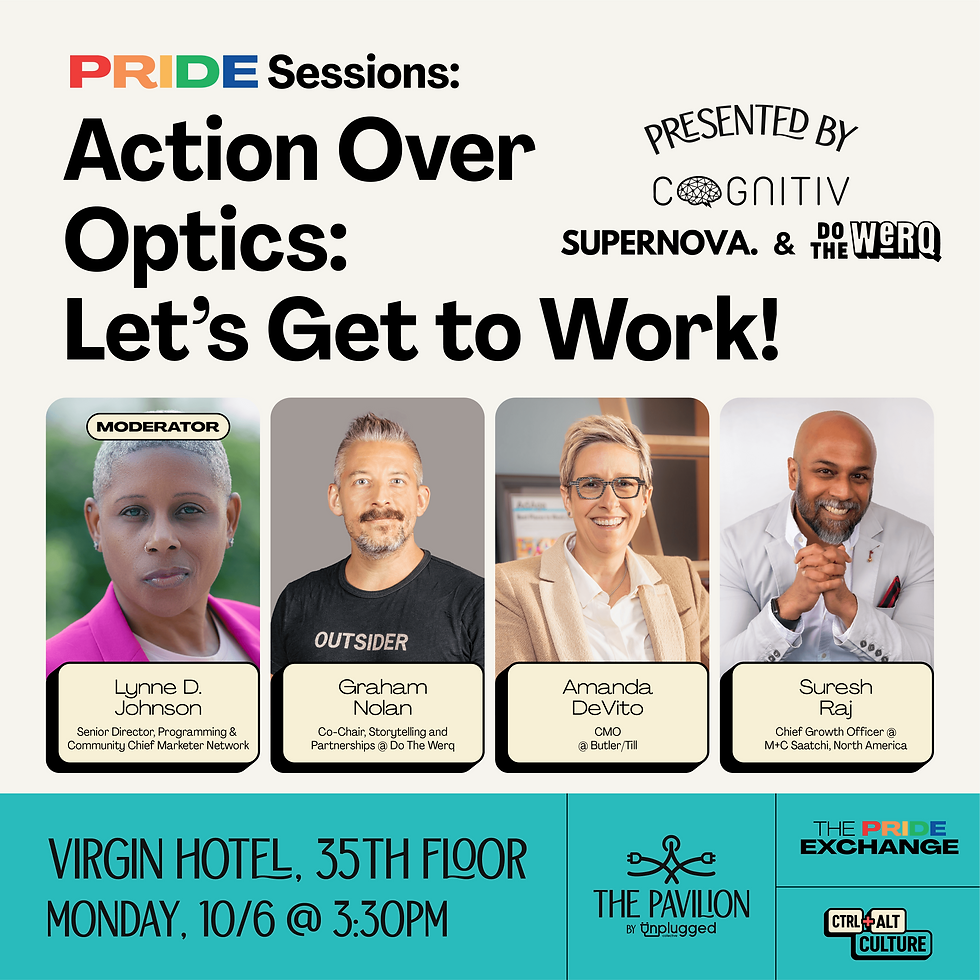 Then comes the room everyone will be talking about: a not-a-panel under the banner “Action Over Optics,” with leading voices including Lynne d Johnson (Sr. Director of Programming & Community, Ad Tech & Converged Media, Chief Marketer), Graham Nolan (Co-Chair, Do the WeRQ), Amanda DeVito (CMO, Butler/Till), Suresh Raj (CGO, M+C Saatchi, NA). Expect polite nods to be traded in for durable practice. Do the WeRQ has long reminded the industry that queer creativity is not an accessory but a growth engine. Consider this session your accountability mirror.